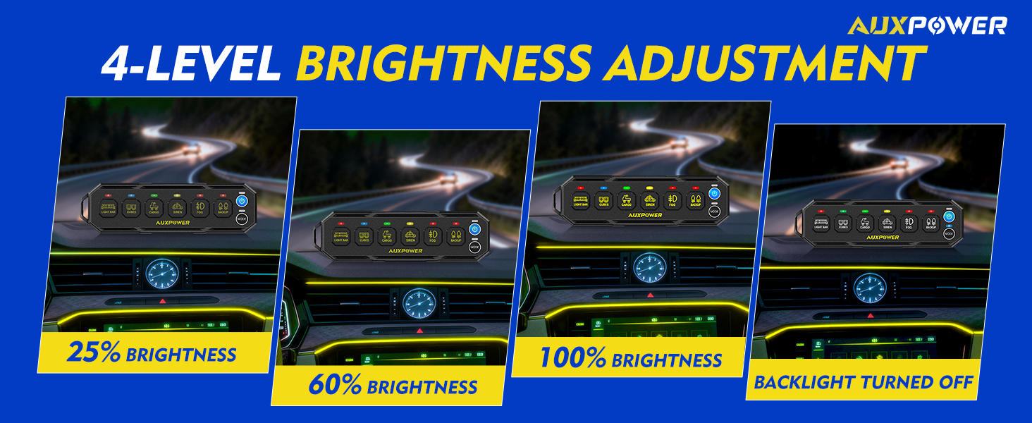 RGB & Backlight Brightness:This 6 gang RGB switch panel lets you customize the backlight color to your preference. Four brightness levels are available: 25%, 60%, 100%, and off — ensuring a comfortable visual experience while driving.