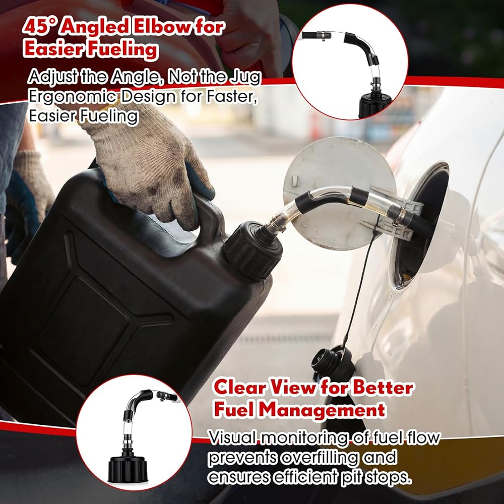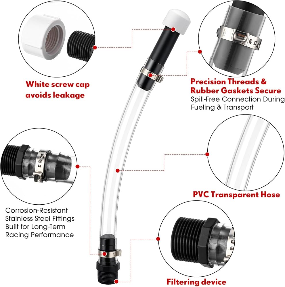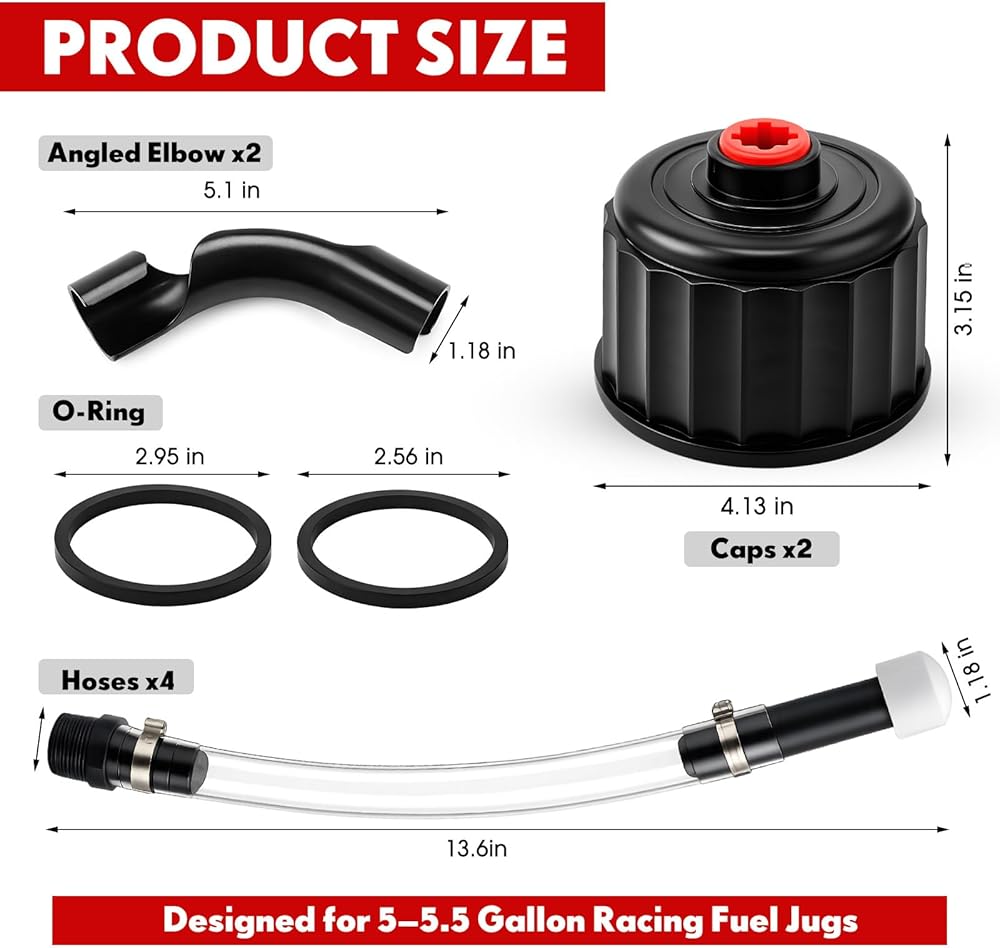 Provides everything needed to refresh aging racing fuel jug equipment: filler hoses, bending tools, and replacement caps. All components work together as a complete fuel management solution for racing applications.