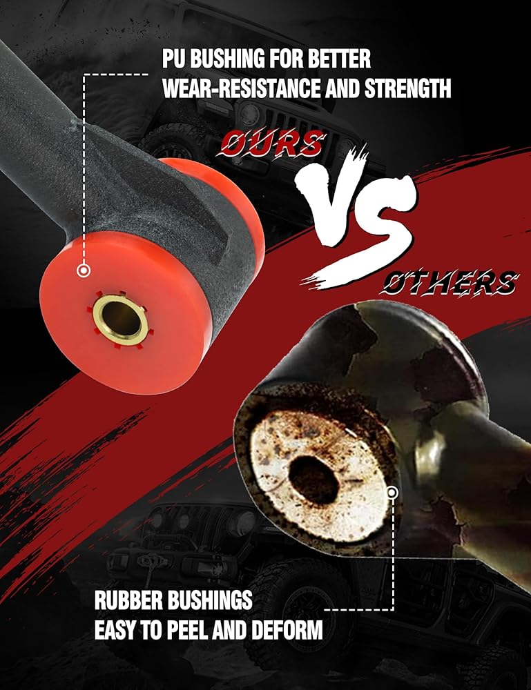 Heavy-Duty Construction with Polyurethane Bushings: Built from thick-wall tubular steel for superior strength and durability. Equipped with high-quality polyurethane (PU) bushings that resist wear and maintain suspension performance under heavy loads and off-road conditions.