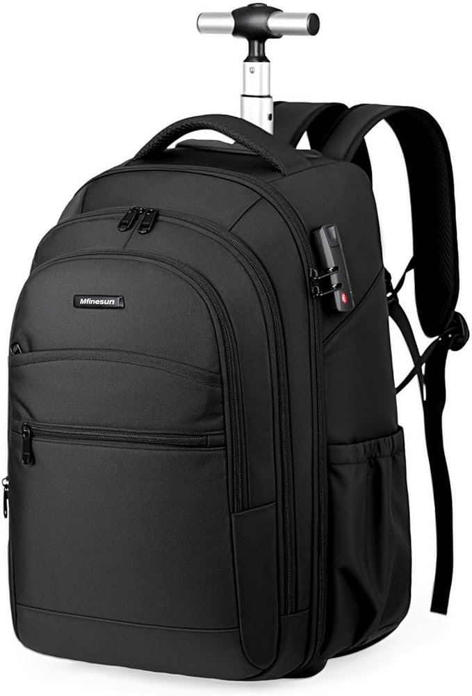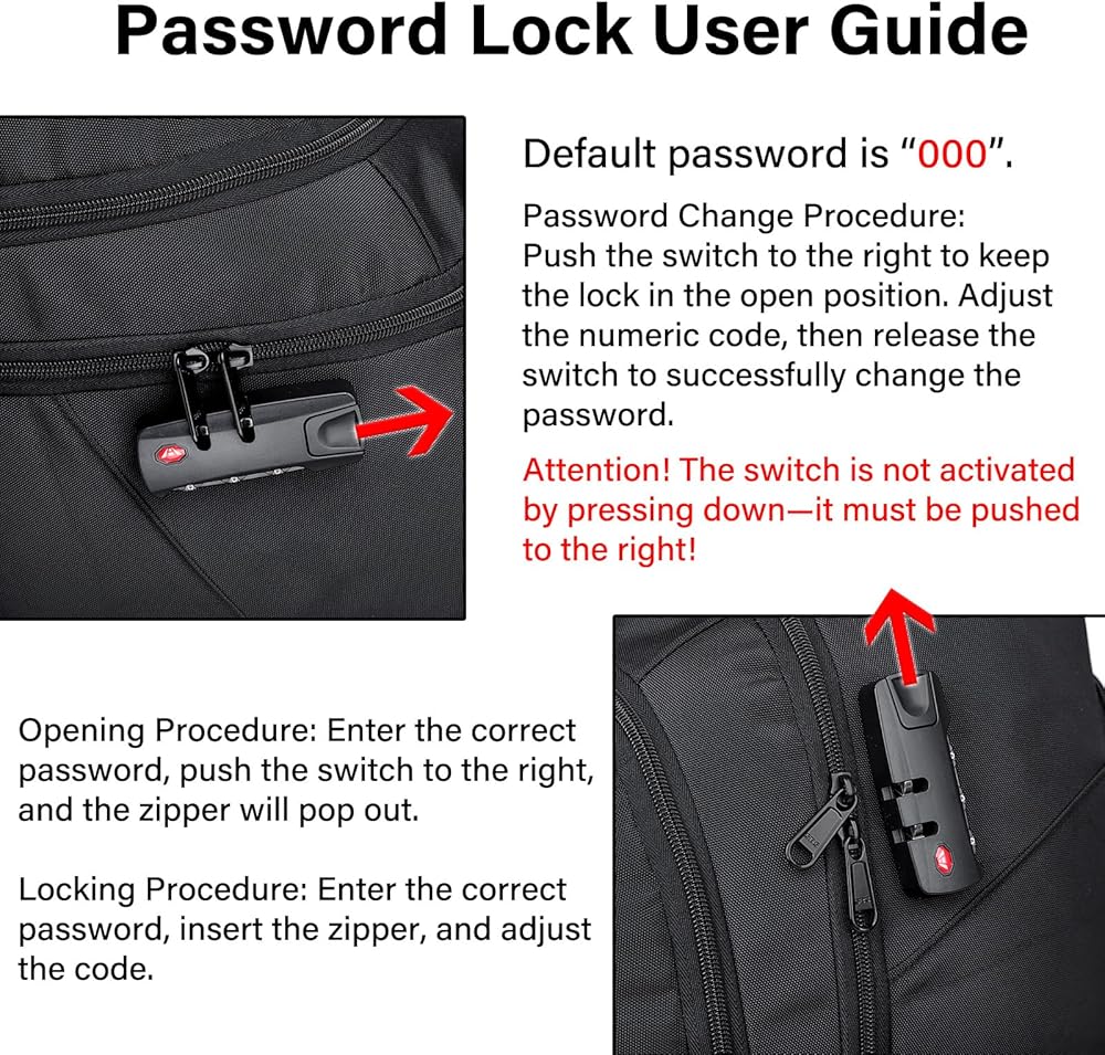 Mfinesun 17-inch Black Wheeled Backpack features a streamlined design that combines versatility with practicality. It includes silent wheels, an extendable aluminum alloy handle, a built-in padded laptop compartment, dedicated accessory pockets, dual side water bottle pockets, and elastic straps for securing clothing, all within a lightweight construction. Password Lock User Guide: Default password is “000”. Password Change Procedure: Push the switch to the right to keep the lock in the open position. Adjust the numeric code, then release the switch to successfully change the password. Opening Procedure: Enter the correct password, push the switch to the right, and the zipper will pop out. Locking Procedure: Enter the correct password, insert the zipper, and adjust the code. Attention! The switch is not activated by pressing down—it must be pushed to the right!
