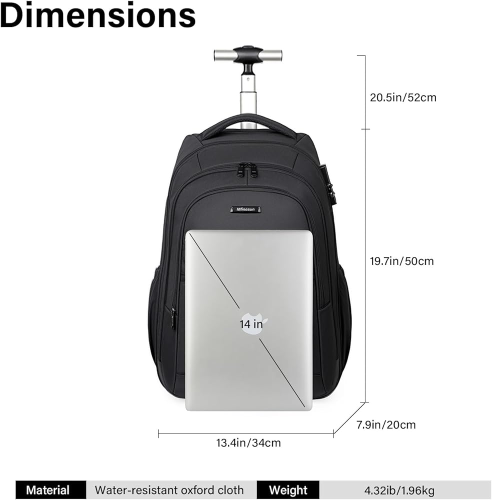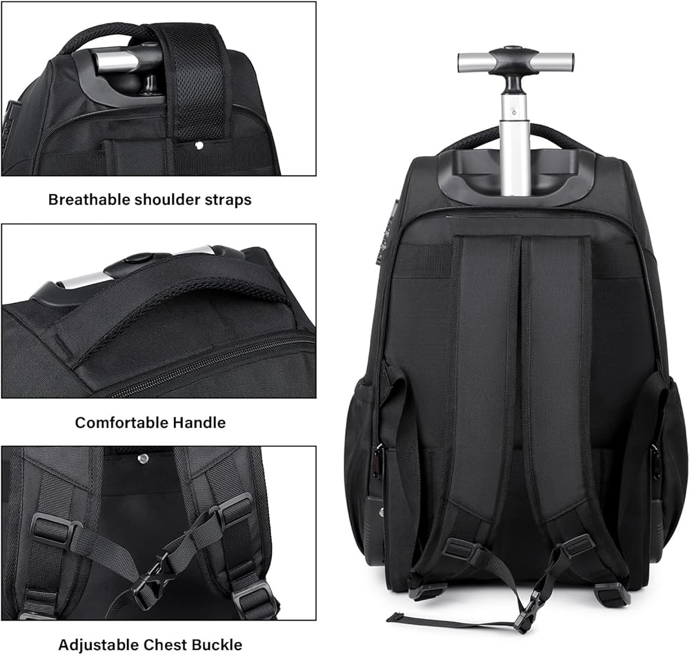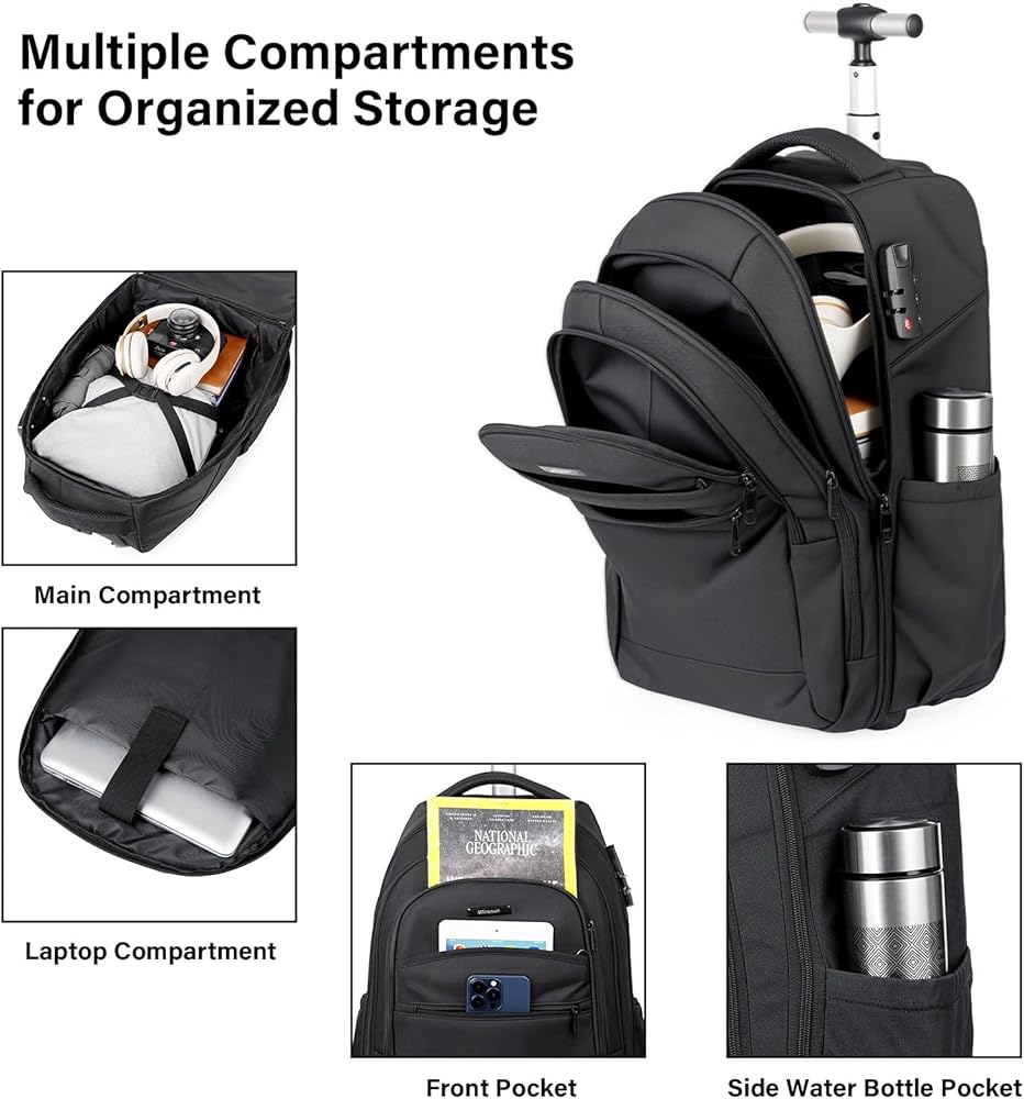 Large Capacity - This wheeled backpack offers a spacious 36-liter capacity. Its main compartment features a laptop compartment that fits devices up to 17 inches with Combination Lock, making it ideal for business travel. Features 6 practical pockets: a quick-access passport pocket, front storage pocket, side water bottle pocket, and more. Multiple compartments and storage pockets keep your essentials organized