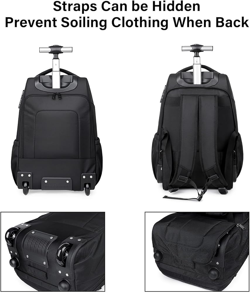Portable Design - The backpack features breathable, adjustable shoulder straps. When rolling the backpack, the straps can be tucked into zippered pockets to prevent dragging. When carrying the backpack, the zippered pockets can be lowered to cover the wheels, keeping your clothes clean
