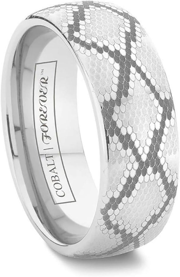 The cobalt chrome counterpart to our unique snakeskin laser design tungsten ring, PYTHON. The BOA is a polished domed cobalt ring in your choice of 6mm and 8mm widths and is sure to garner attention with it's detailed snake-inspired laser engraved pattern. Lifetime Sizing, Lifetime Warranty.