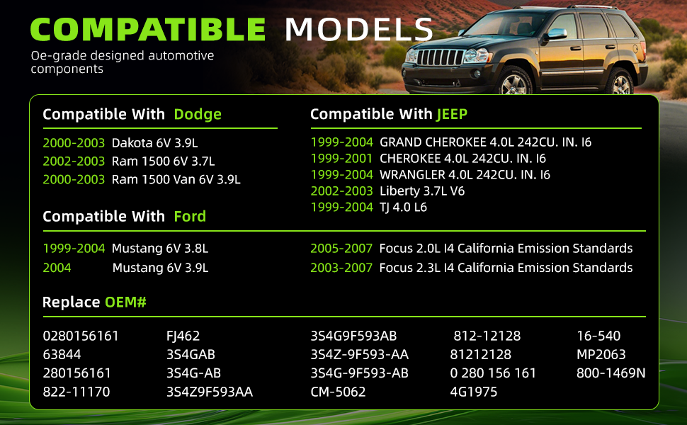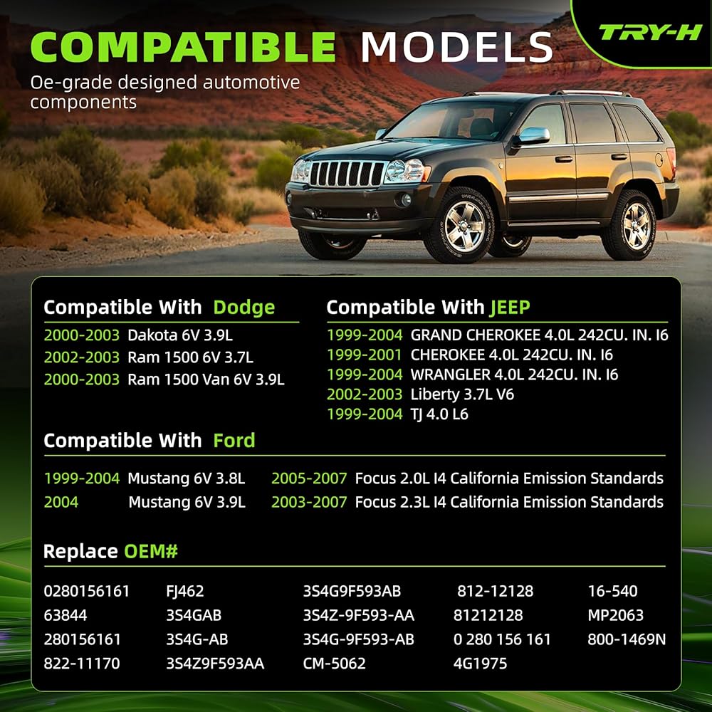 Compatible: for 1999-2004 JEEP GRAND CHEROKEE 4.0L 242CU. IN. I6, 1999-2001 CHEROKEE 4.0L 242CU. IN. I6, 1999-2004 WRANGLER 4.0L 242CU. IN. I6, 2002-2003 Liberty 3.7L V6, 1999-2004 TJ 4.0 L6. for 2000-2003 Dodge 2000-2003 Dakota 6V 3.9L, 2002-2003 Ram 1500 6V 3.7L, 2000-2003 Ram 1500 Van 6V 3.9L. Fits for 1999-2004 Ford Mustang 6V 3.8L, 2004 Mustang 6V 3.9L, 2005-2007 Focus 2.0L I4 California Emission Standards, 2003-2007 Focus 2.3L I4 California Emission Standards.