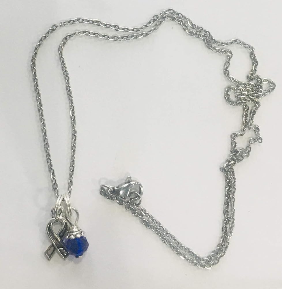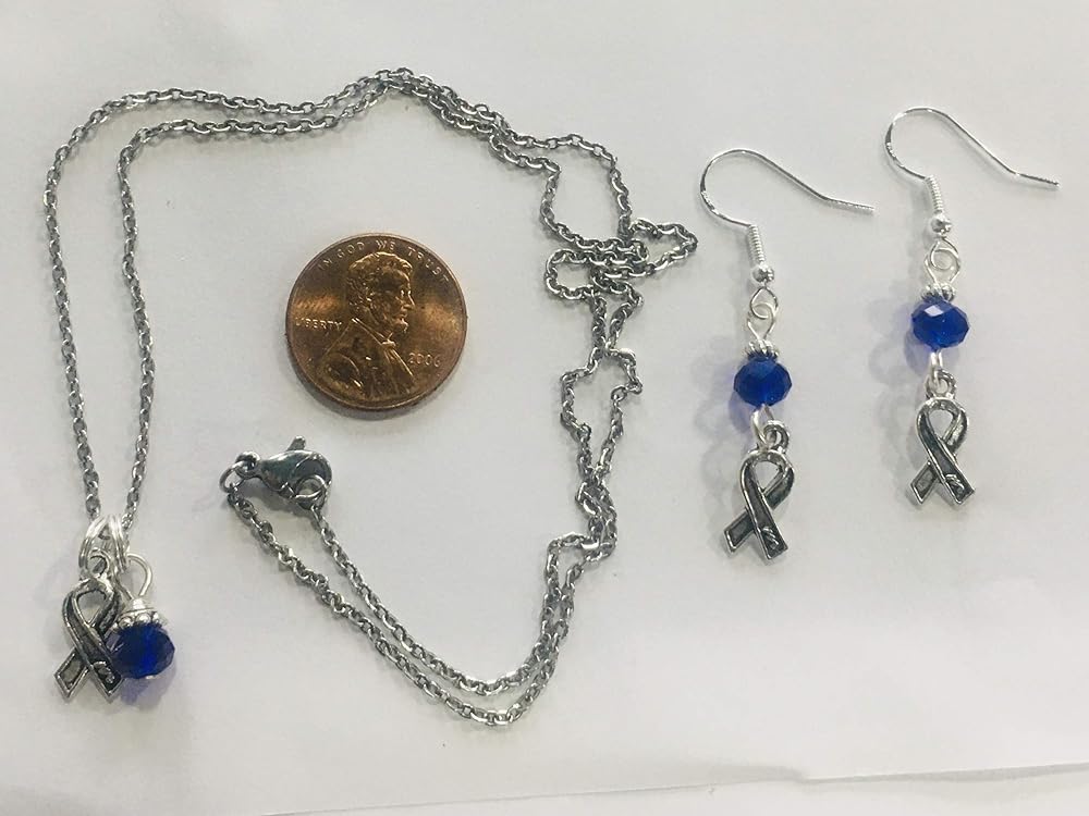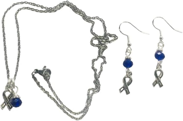 Colon or Colorectal Cancer Survivor Supporter Cobalt Royal Blue Ribbon Necklace & Earring Set - Small pewter ribbon awareness charms accented with cobalt blue faceted crystal beads on sterling silver earwires (for happy ears) pair with a necklace with the same delicate ribbon awareness pewter charm accented with a delicate dangling periwinkle crystal bead drop, on an 18 inch stainless steel (non tarnish) chain. A great set! Earrings $8.49, necklace $7.99, set price discounted at $14.99.