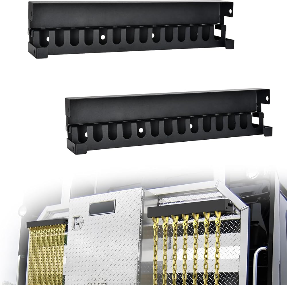 【Versatile & Lock-Ready】 The trailer cab rack chain hanger fits semi-trucks, wreckers, and deck trucks. This trailer chain hanger features a lockable design (lock not included) to keep up to 14 chains or binders secure, while keeping your chains and binders organized, accessible, and clutter-free on the road.