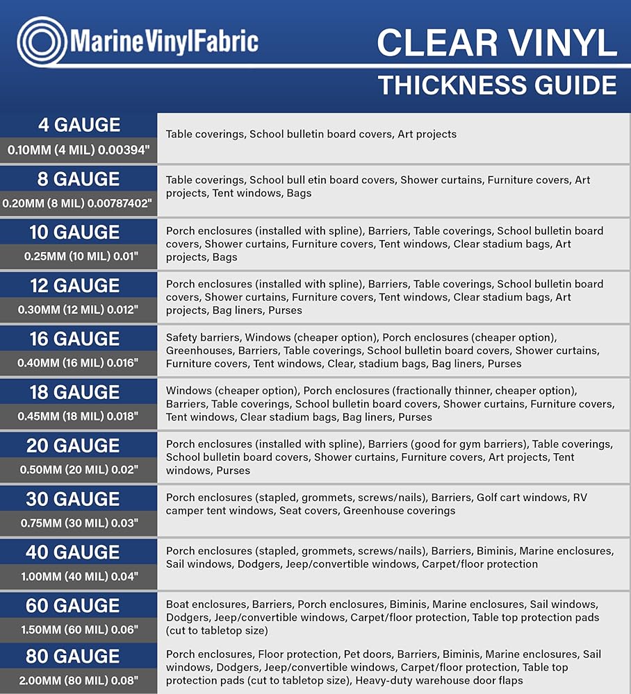 CHOOSE YOUR GAUGE – Available in 4–80 gauge thicknesses to match any project. From flexible lightweight vinyl to heavy-duty panels built for outdoor exposure, Marine Vinyl Fabric offers the perfect option for your needs.