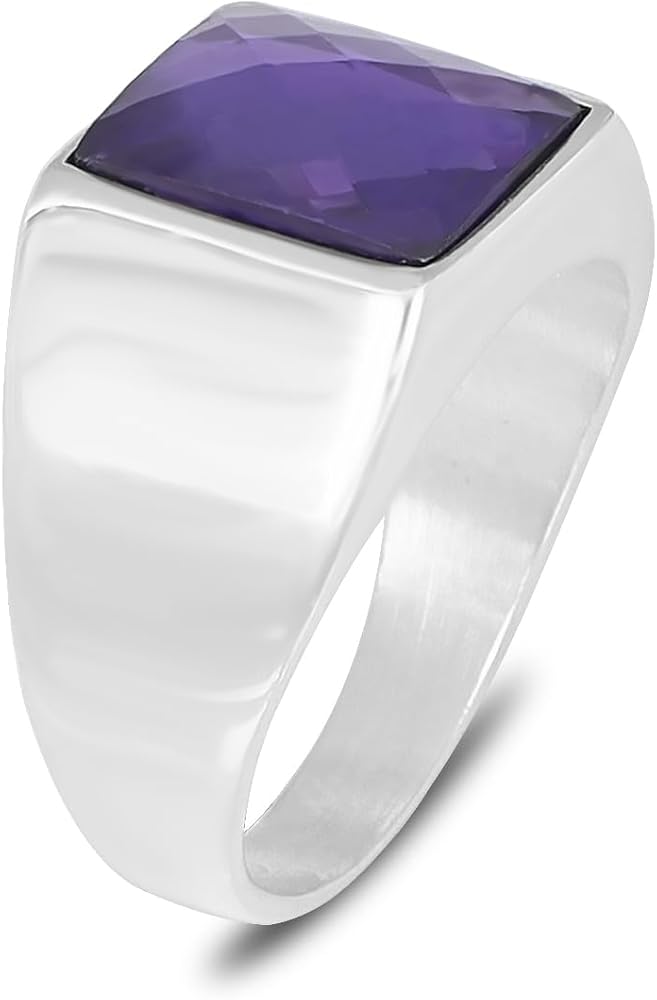 Men’s Silver Plated Steel Amethyst Ring – Faceted Amethyst Stone Minimal Signet Ring | Polished Smooth Band | Modern Stainless Steel Men’s Ring Fashion Jewelry