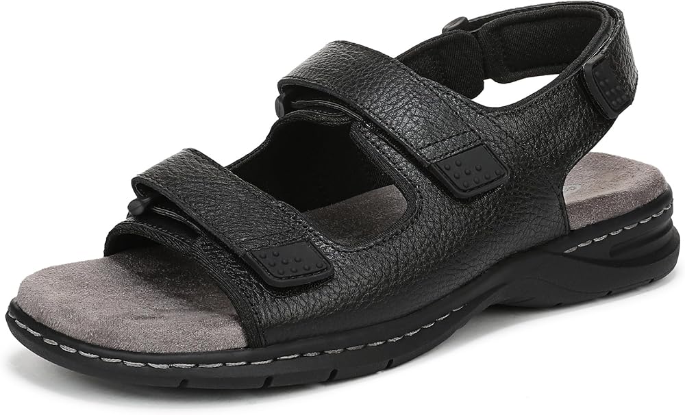Step out in all-day comfort and style with these men's sandals—your new go-to for easy movement and iconic cool. ICONIC COMFORT: Insole Technology with anatomical cushioning, comfort, & support. FIT: Adjustable hook-and-loop closure for a customizable fit. STYLE: Round open toe, slingback sandal with a single wide strap, textured strap surface, visible stitched detailing, and a supportive 1 1/2 inch flat heel. MATERIALS: Leather upper responsibly sourced through Leather Working Group-certified tanneries. SUSTAINABLY CRAFTED: Fabric lining. MOVEMENT: Lightweight, flexible construction moves with you. CONSCIOUSLY PACKAGED: This style is shipped in an environmentally preferred 1-piece box made with primarily recycled materials that can be recycled & soy-based inks. Meet the OG of comfortable sandals for men—crafted for effortless style wherever the season takes you. The Gavin Slingback is the men's sandal that brings iconic Dr. Scholl's comfort and support to every adventure.