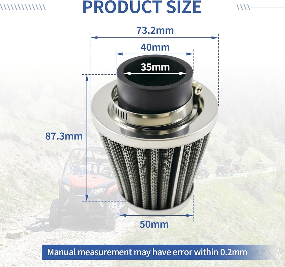 【Size】Internal Diameter:35mm/1.38", Length of Air Filter: 87.3mm/ 3.5"; Width of Air Filter: 73.2mm/ 2.88".