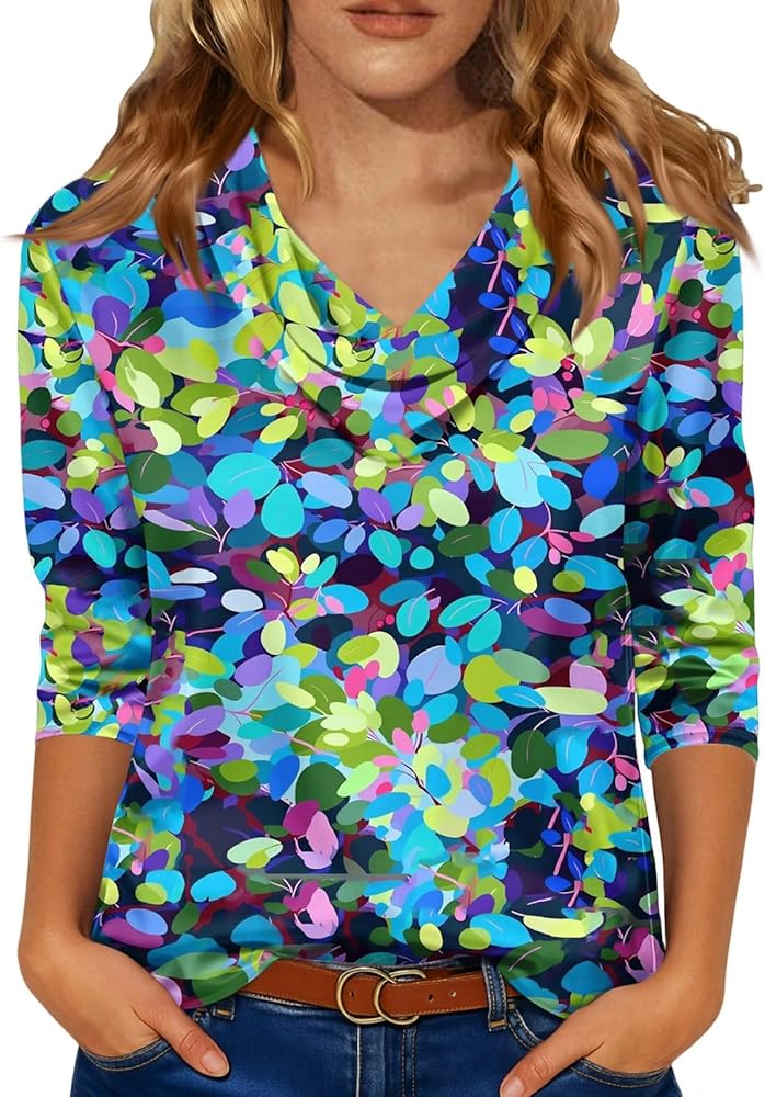 Womens V Neck T Shirts 3/4 Sleeve Casual Shirt Soft Flowers Print Basic Pile Collar Tops Fashion Outfits in Kuwait
