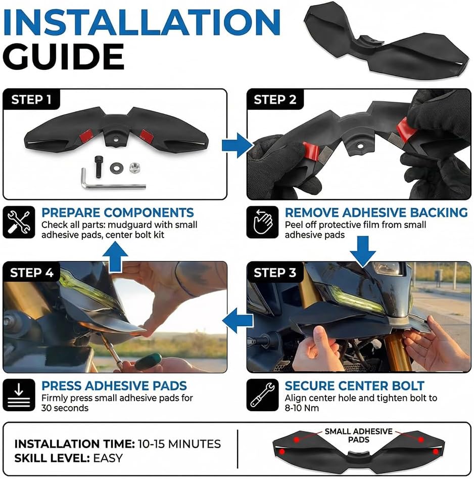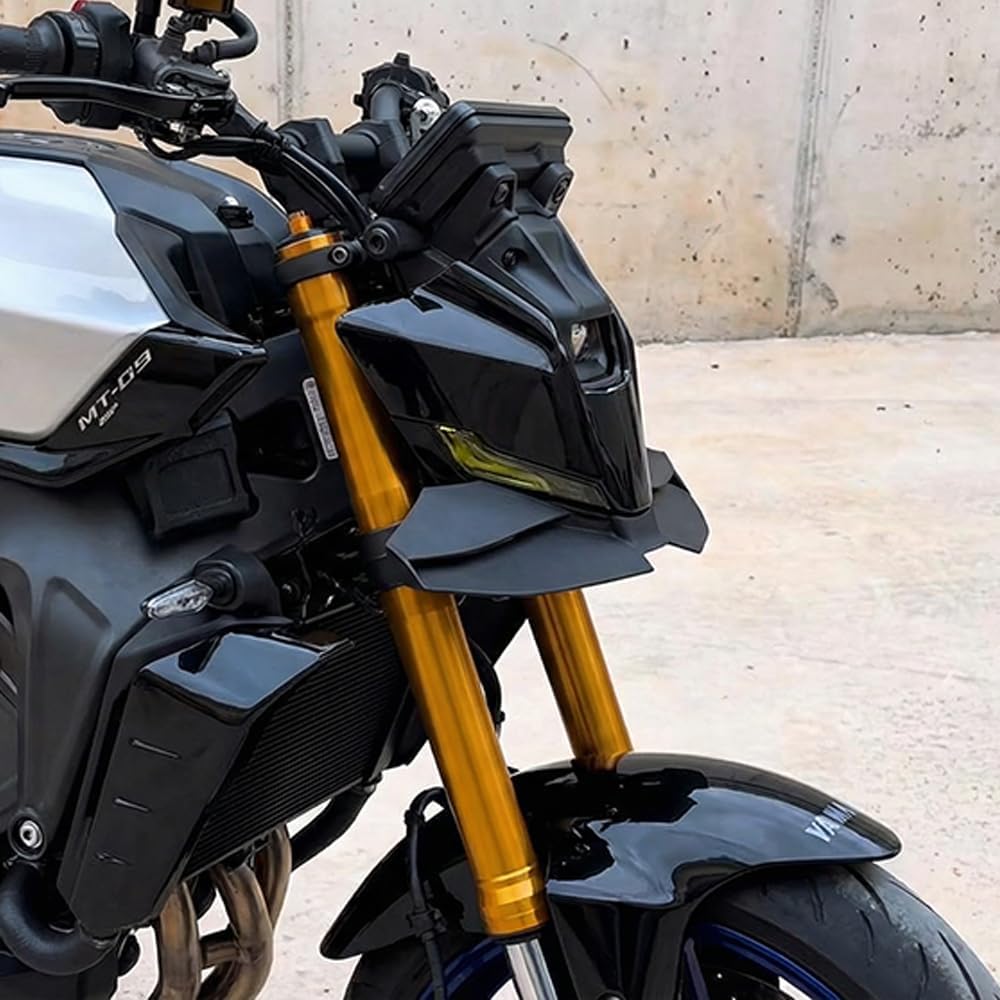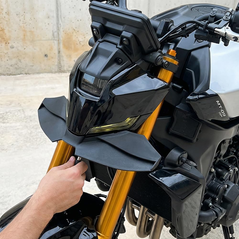 Aerodynamic Front Spoiler Kit for MT-09/MT-09 SP This component is designed for the 2024-2025 fourth-generation MT-09 and MT-09 SP models. It aims to positively influence both daily and sport riding by improving aerodynamic performance. Design Features & Potential Benefits 1. Vehicle-Specific Design Molded using factory body data for a designed fit to the vehicle's front cowling contours. Utilizes existing OEM mounting points for relatively straightforward installation. 2. Aerodynamic Considerations Its winglet profile is designed to manage airflow, which may contribute to increased front-end downforce at higher speeds. By helping to manage under-body airflow, it aims to reduce aerodynamic drag, potentially benefiting high-speed stability and fuel efficiency. 3. Material & Construction Constructed from high-strength composite materials, focusing on structural reliability while managing weight. Offered in a black finish designed to coordinate with the motorcycle's original styling. 4. Potential Riding Experience May contribute to a more planted feel and reduced wind buffeting during high-speed cruising. May provide a sense of increased front-end stability during acceleration, braking, and cornering. Summary This front spoiler kit is intended for MT-09/MT-09 SP owners looking to enhance their bike's aerodynamic profile and potential high-speed stability. Its design focuses on integration with the original machine, aiming to offer an installation option that balances functional and visual updates.