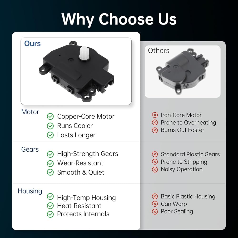Key Function: This HVAC Blend Door Actuator precisely controls the blend door position to regulate hot and cold air flow into your cabin, ensuring accurate temperature based on your settings. It plays an essential role in cabin comfort by responding quickly to climate control adjustments. A faulty actuator can disrupt temperature regulation, making replacement critical for optimal HVAC performance.