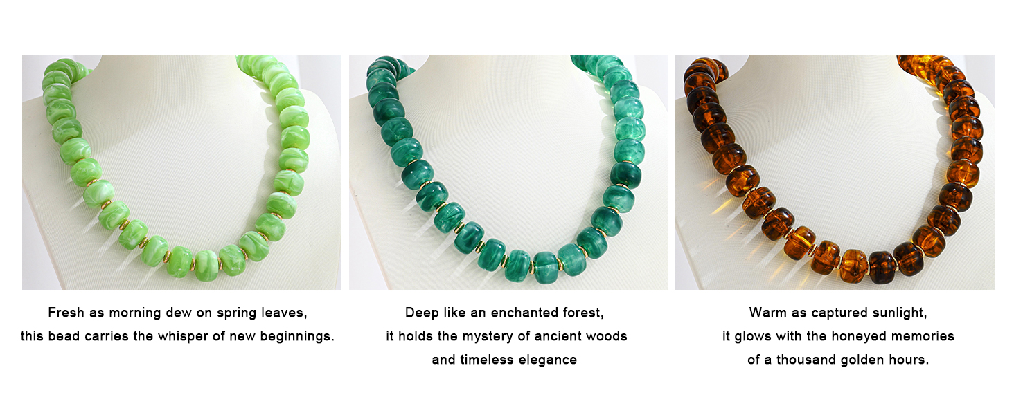 Warm Amber Tone: This bead necklace features beautiful amber-colored resin beads that capture and reflect light, reminiscent of honey and sunlight. The warm tones mixed with gold-plated beads make this statement necklace a timeless and cozy accessory.