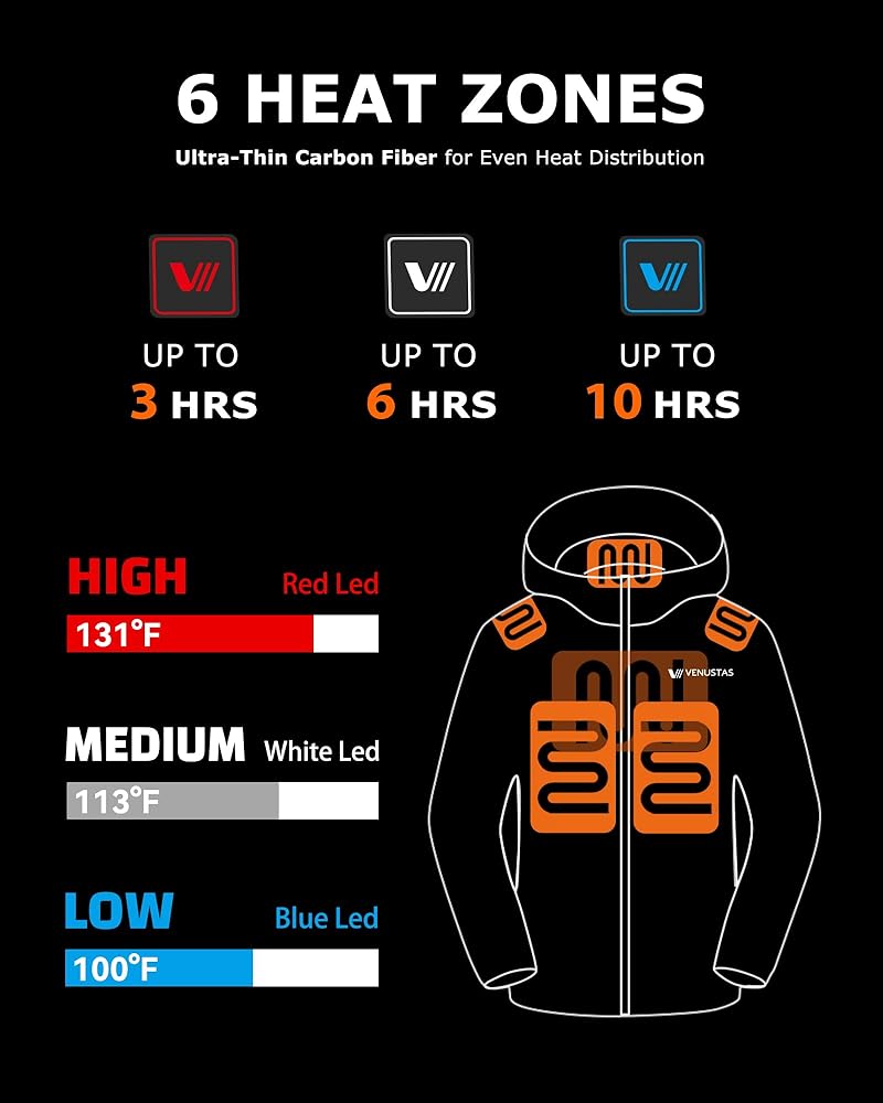 UPDATED DESIGN - New SILVER mylar thermal Lining is skin-friendly, the best POLY HEAT SYSTEM, ensures you don't lose any excess heat and enjoy more warmth than other heated linings on the market. HEAT UP TO 8 WORKING HOURS with certified Venustas battery, USB port for charging smartphones and other mobile devices.