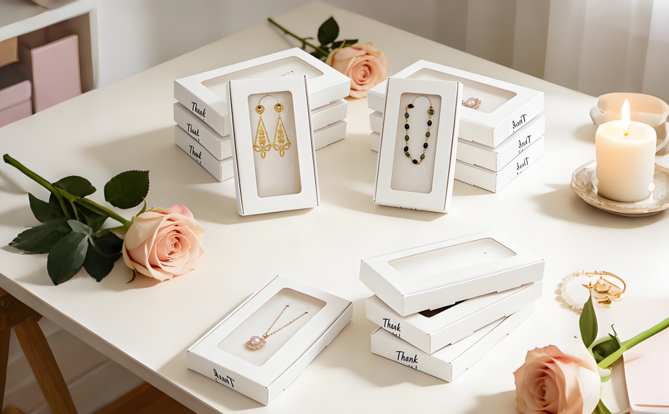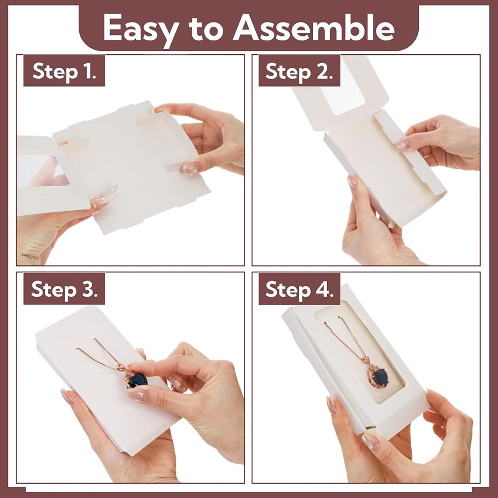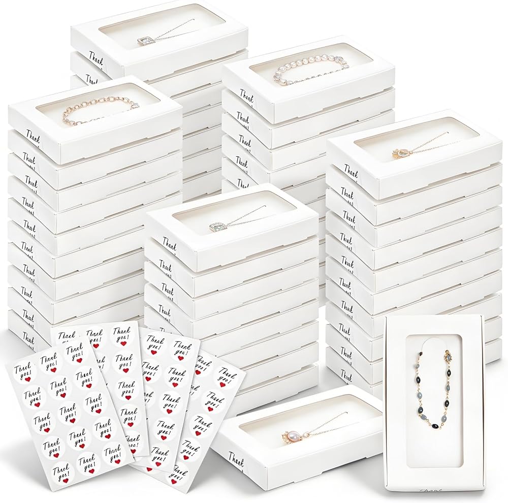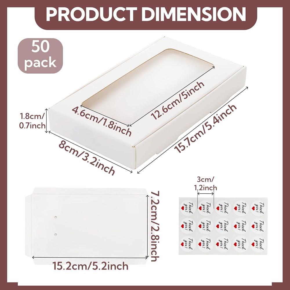 50 Pack Jewelry Packaging Boxes, 5.4'' x 3.2'' x 0.7'' Paper Necklace Gift Box with Clear Window Display Card Stickers, Sublimation Keychain Packaging Box for Bracelets, Earrings Displaying