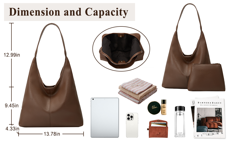 Perfect Dimension: 35*11*24 cm/ 13.78*4.33*9.45 inch, with the handle 33 cm/ 13 inch. This leather shoulder bag has a pouch and large capacity, can easily meets your daily needs