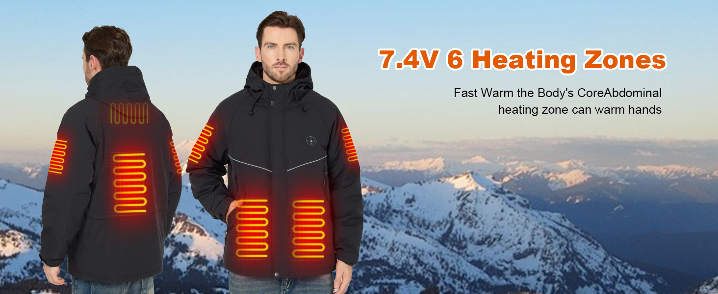 The heating component of heated jacket is made of imported Carbon Fiber, and it has 6 heated areas, including the neck, abdomen*2, back, arms*2. With mature heated technology, this heating jacket can warm up rapidly in extremely cold weather.