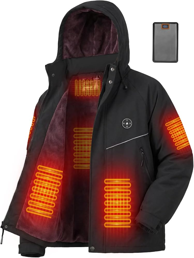 【Fleece Lining & Light ON/OFF Buttons】Men's heated jacket features a wool lining plus a high-quality thermal shell, designed to eliminate cold gaps. It comes with an adjustable drawcord that wraps around the face, and the hood is also lined with wool to lock in heat. The Brimekey heated coats with light-out function are designed to give you the freedom to switch between discreet and eye-catching.