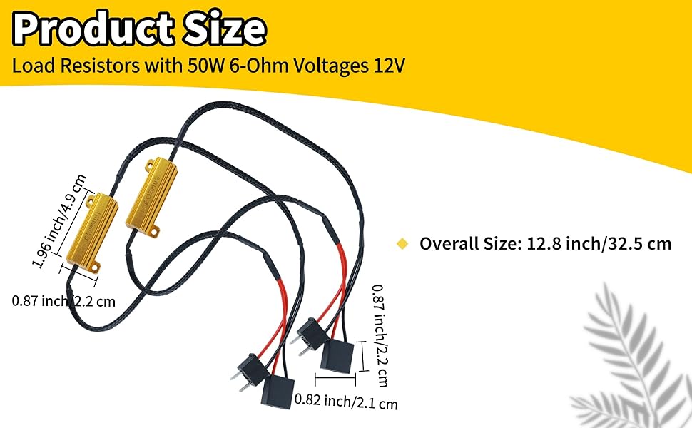 Package Included: 2 packs of load resistors with 50W 6-Ohm, Voltages: 12V. The hyper flash resistor turn signal with plug wire length: 32.5cm /12.8", decoder size: 4.9x2.2 cm/ 1.96"x0.87"(L*W)