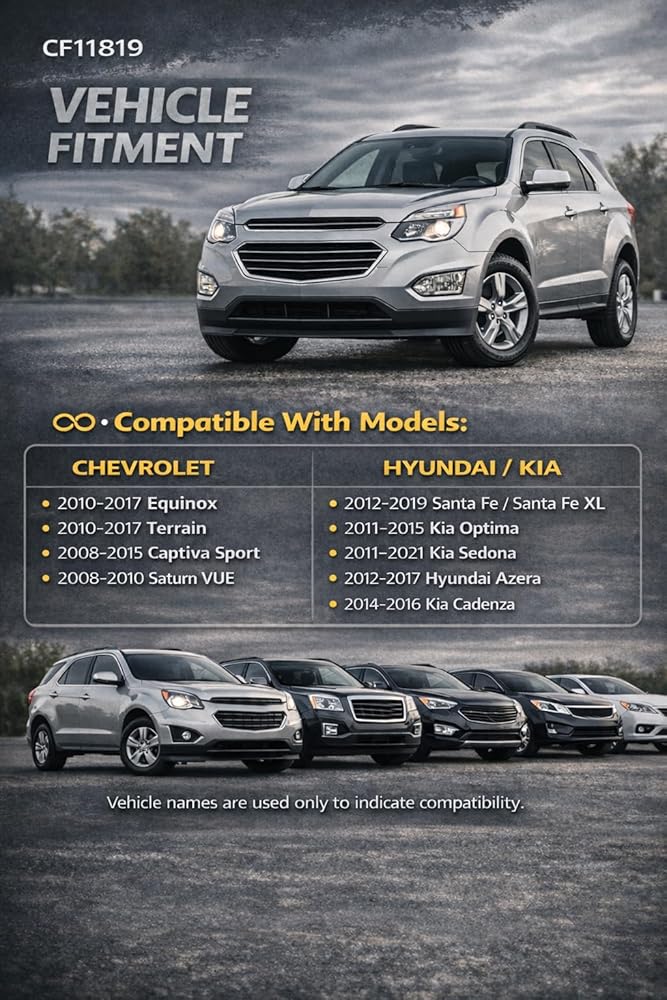 [Vehicle Fitment] - Fits for Chevy Equinox 2010-2017(L4-2.4L) & 2010-2012(V6-3.0L) & 2013-2017(V6-3.6L); Chevy Captiva Sport 2012-2015(L4-2.4L) & 2011-2013(V6-3.0L).