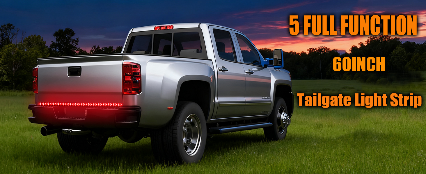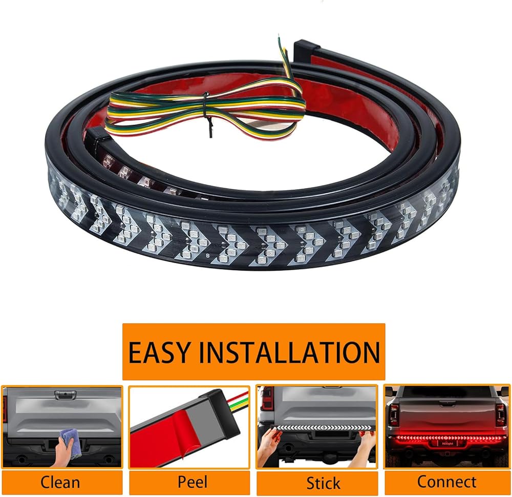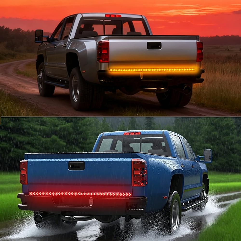 【Intelligent 4-in-1 Multifunction Lighting】This 60in light strip integrates four essential functions into one sleek unit: Bright Red Running Light (with a unique scanning effect), High-Visibility Brake Light (flashes three times then stays solid red for maximum alert), Sequential Amber Turn Signals (for a modern, clear directional indication), and an Amber Double Flash Hazard Mode (activates both sides simultaneously for emergency warnings).
