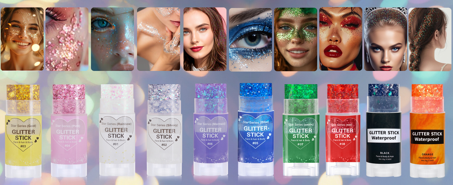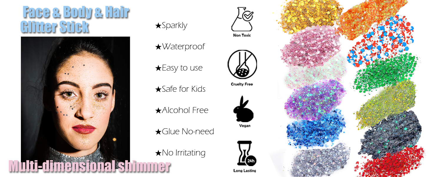 SAFE INGREDIENTS AND WATERPROOF:Crafted with safety in mind, the white body glitter stick is made from gentle, non-toxic ingredients that are safe. Whether it's for a costume party, festival, or just for makeup,it leaves a waterproof and long-lasting glitter of sparkling that stays put through rain or shine