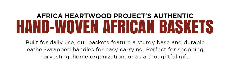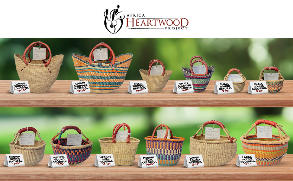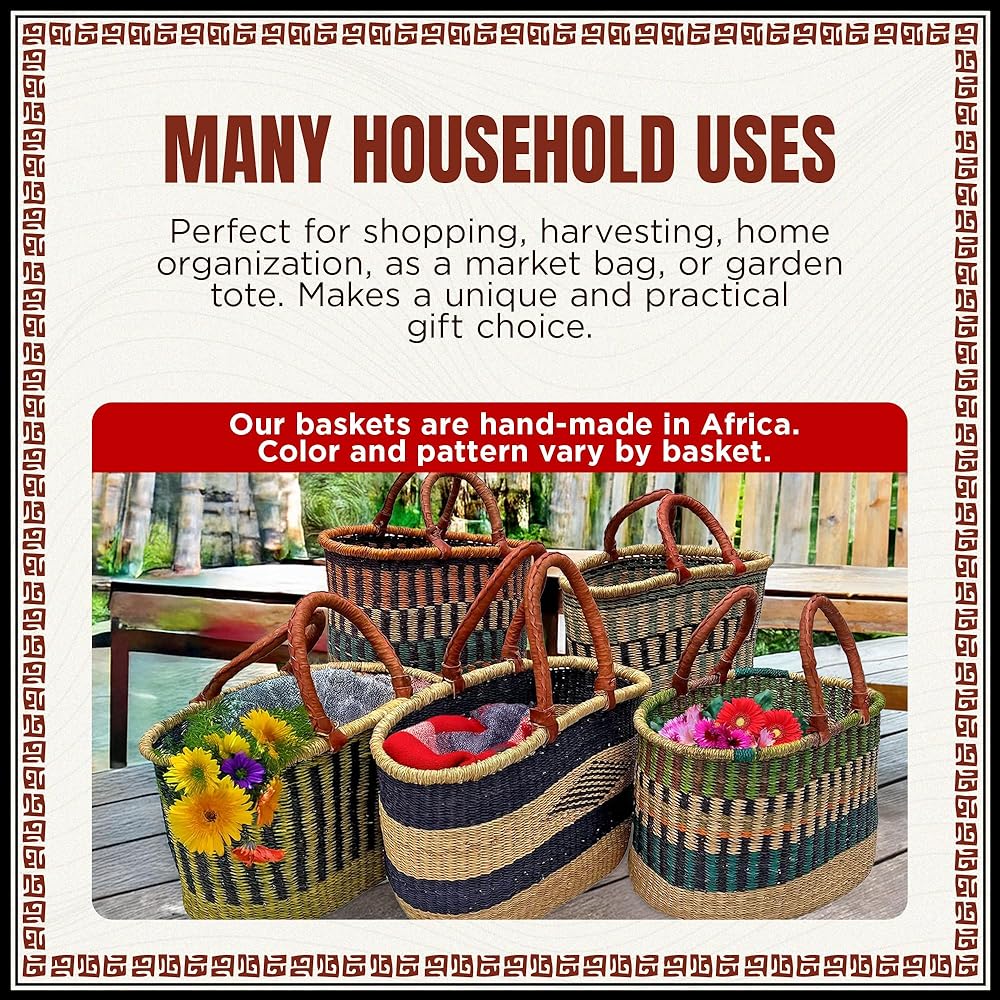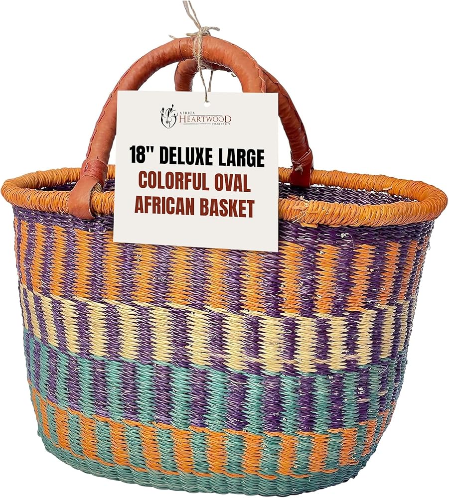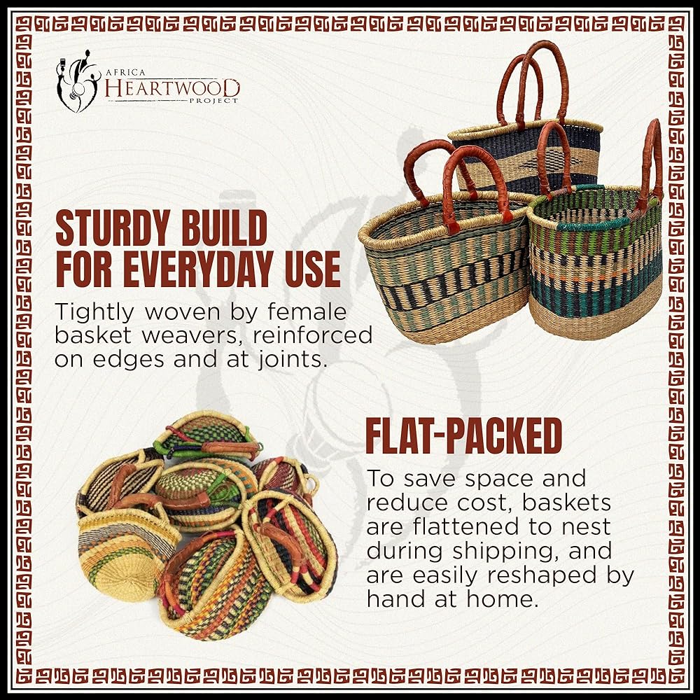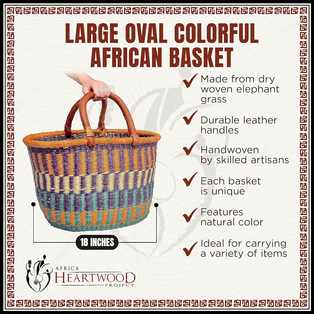 Africa Heartwood Project - Deluxe Large Oval Colorful African Basket with Leather Handle - Classic Heartwood Bolga Market Basket from Women in Bolgatanga, Ghana - 18" Oval Flat-packed