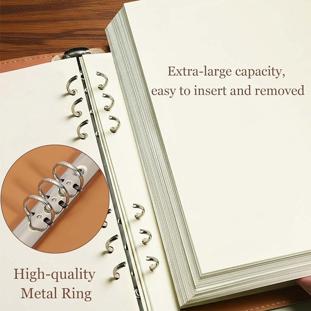 Refillable 6-Ring Design for Flexibility: The sturdy 6-ring metal binder allows you to easily add, remove, or rearrange pages as needed. Simply press both ends to open the rings and customize your notebook layout effortlessly. Ideal for creating personalized planners or journals.