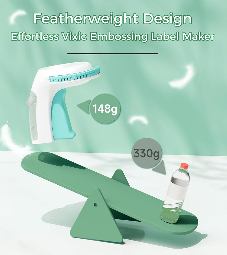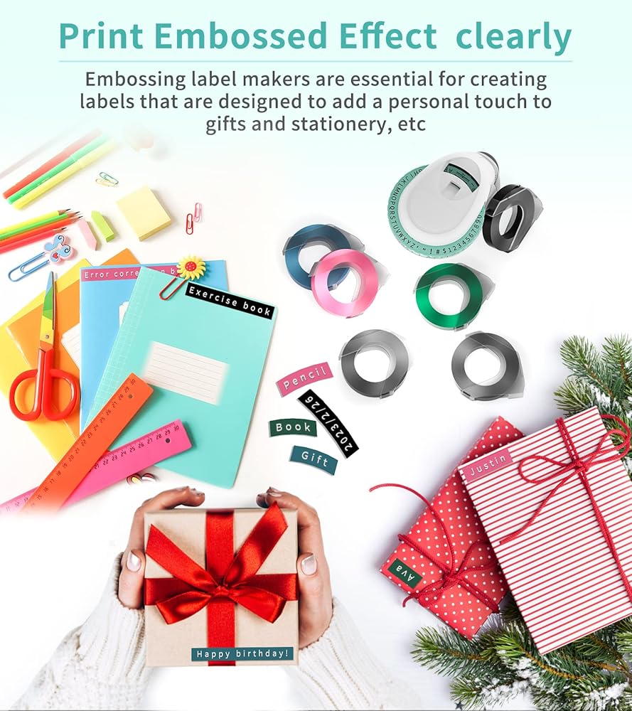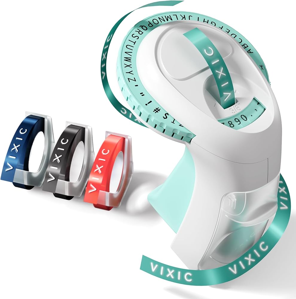 Vixic Embossing Label Maker Machine- Label Maker Writter Easy create labels with an Intuitive turn and press labeling system, No battery or electricity or ink. The green embossing label maker with 3 rolls, 3/8inch x 9.84feet each roll, White on Black x 1, White on Red x 1, White on Lake Blue x 1