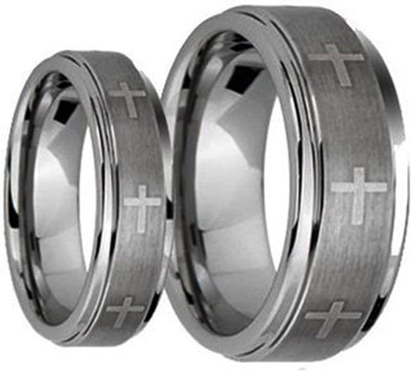 Wedding Rings for Him and Her - 8MM/6MM Brushed Center With Laser Cross Engraved Shiny Edge Tungsten Carbide - Couple Rings Set - Wedding Bands for Couples - Wedding Band Sets for Couples