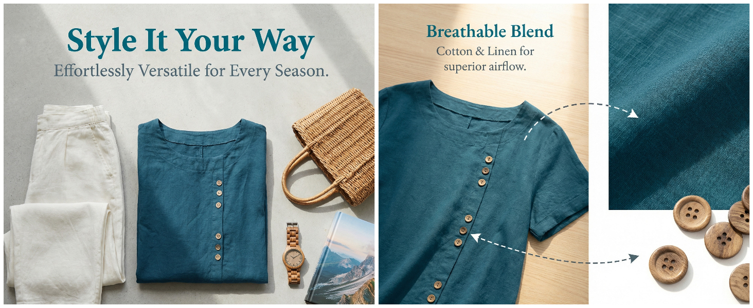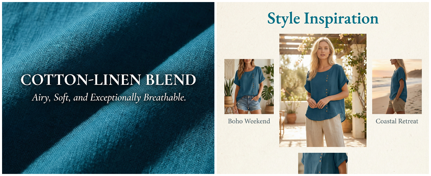 Premium Cotton Linen Fabric: Crafted from a 60% cotton and 40% linen blend, this lightweight blouse offers a soft, skin-friendly feel. The breathable, natural textile ensures maximum airflow, keeping you cool and comfortable during hot summer days.