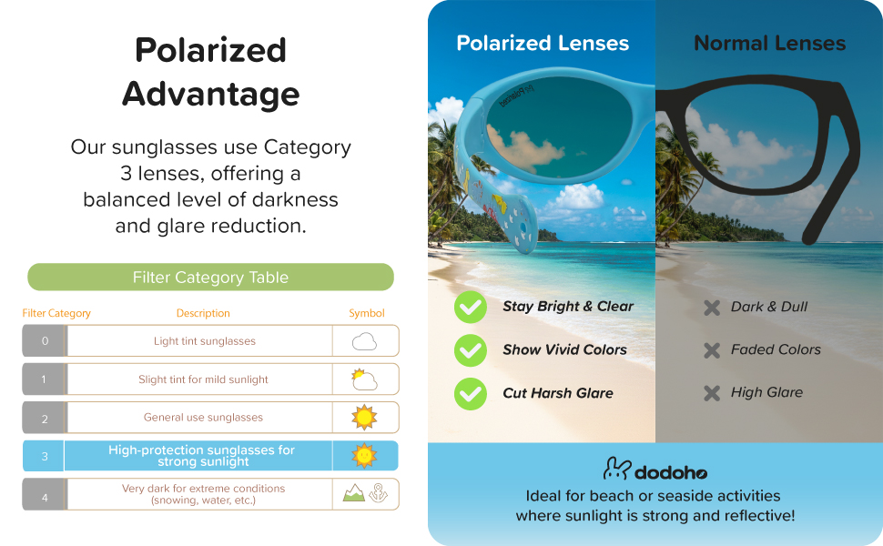 Keep your little adventurer ready for every outing with Dodoho's kids polarized sunglasses featuring an adjustable elastic strap. The UV400 polarized TAC lenses cut glare from water, sand, and pavement while blocking 100% of harmful UVA and UVB rays. Perfect for beach trips, family travel, and outdoor play.