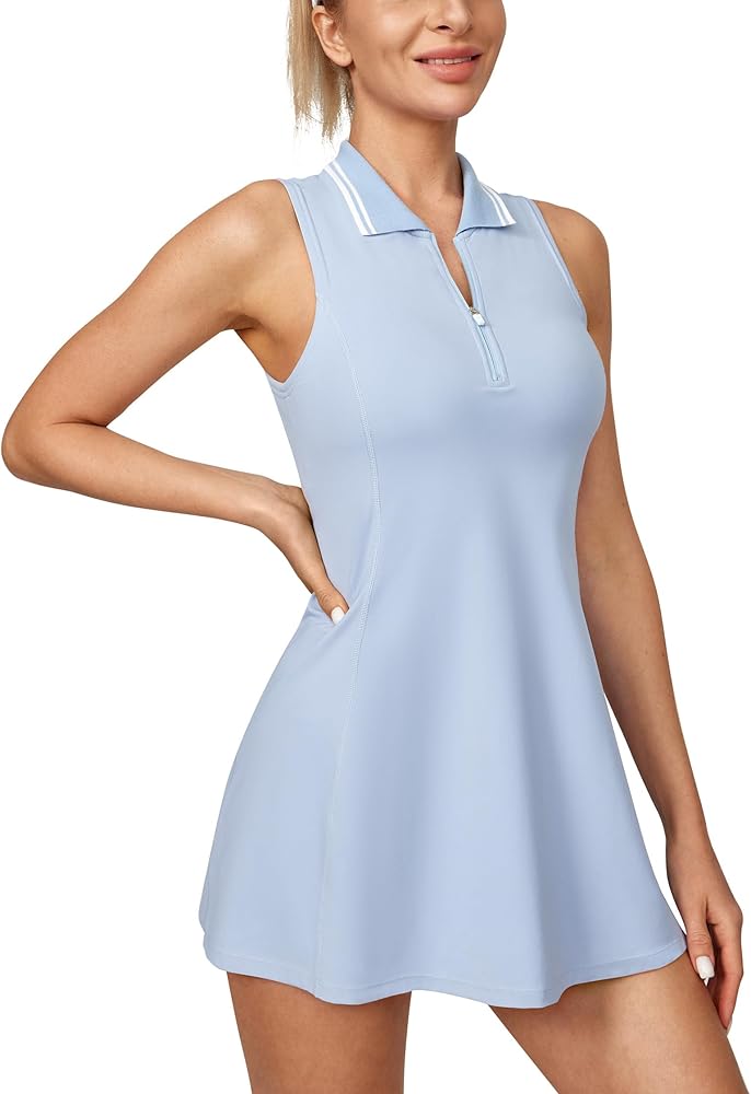Half-Zip Front & Built-in Bra: Heathyoga golf dress with half-zip front and allow you to wear it in different styles. The V-neckline and classic polo collar accentuate the elegance and charm of your neck and shoulder. Tennis dress with built in shorts and bra for total coverage and ease of movement, provides you the possibility that you can reach to return every serve without anything holding you back. The internal elastic band can provide extre support.