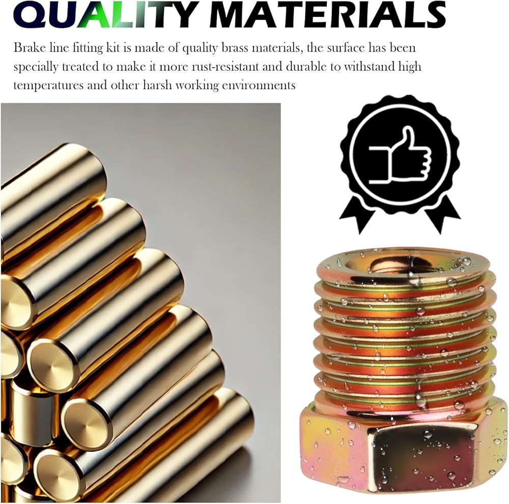 • Quality Materials: Brake line fitting kit is made of quality brass materials, the surface has been specially treated to make it more rust-resistant and durable to withstand high temperatures and other harsh working environments, and still maintain long-term stable use, not easy to aging