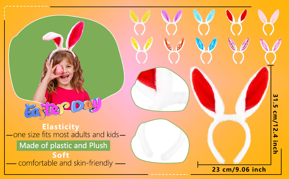 【One Size Fits Kids Adult】: The Easter bunny ears headband is apporx. 20 x 29 cm/ 7.87 x 11.42 inch (L x W), the bunny ears have built-in steel wires, which can be bent into different shapes, with some elasticity, one size fits most adults and kids.