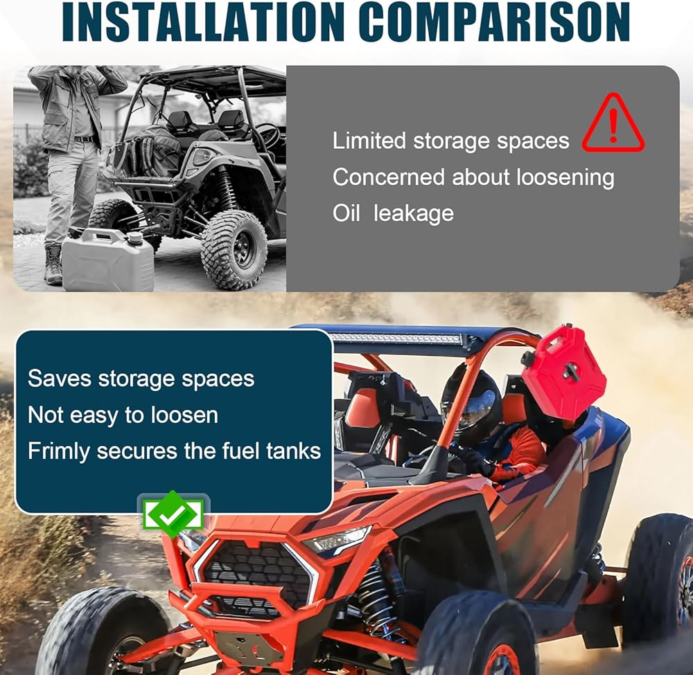 ★【Fitment】The gas tank mount holder is compatible with for ATV UTV Polaris RZR Ranger General Talon Pioneer Can Am Maverick X3 Commander Arctic Cat Wildcat Kawasaki Teryx Mule All models of 1'' 1.5'' 1.75'' or 2'' anti-roll bar.Compatible with for standard Gasoline Pack,water pack or storage box.(Compatible with for:RX-1G,RX-1.75G,RX-2G,RX-3G Gasoline Pack;FX-3.5 Gas Can;RX-1W Water Pack, RX-2W Water Pack; RX-2S black interlocking storage can, etc.)