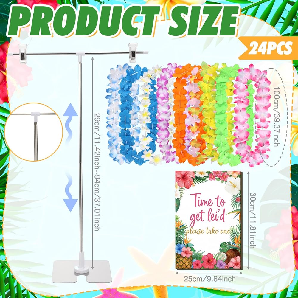 Our comprehensive package includes 1 Poster Display Stand, 1 Wooden Card Sign, and 25 Hawaiian wreaths, offering everything you need for a seamless party setup. Enjoy a hassle-free experience as you create a cohesive and vibrant Hawaiian-themed decor, set to impress every guest.