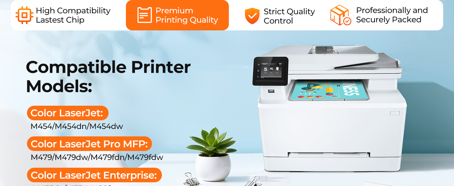 Compatible Printers: 414X Toner Cartridges High Yield 4 Pack Compaible with HP Color LaserJet M454, M454dn, M454dw, Color LaserJet Pro MFP M479, M479dw, M479fdn, M479fdw, Color LaserJet Enterprise M455dn, MFP M480f Printers.