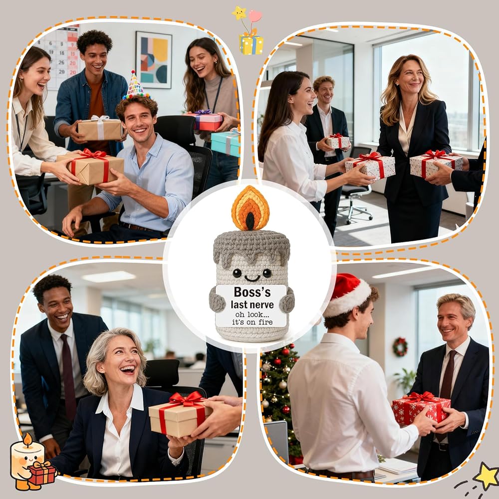 Christmas Gifts for Boss Women Men: The perfect, hilarious tribute to a truly patient leader. This handmade crochet candle perfectly captures the daily chaos, declaring: "Boss's last nerve... oh look... it's on fire." This makes perfect gifts for boss. Celebrate Boss's birthday, chritsmas, or any day, by acknowledging their unwavering commitment and relentless hard work with this thoughtfully crafted present
