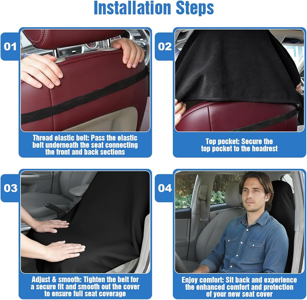 Universal Fit:Tailored for front seats, this car seat cover fits seamlessly with most cars, trucks, SUVs, Jeeps, and sedans. Equipped with adjustable elastic straps, it enables tool-free, quick installation—simply secure the straps to your seat's headrest and bottom, and enjoy a snug, custom-like fit that delivers full protection without compromising comfort.