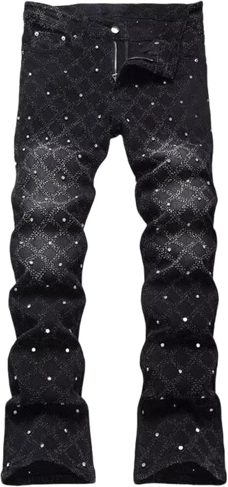 Size:Men's slim fit skinny stacked rhinestone jeans stretch fit distressed jeans for men, has different sizes,please refer to size chart in description, choose your normal size or one size up.