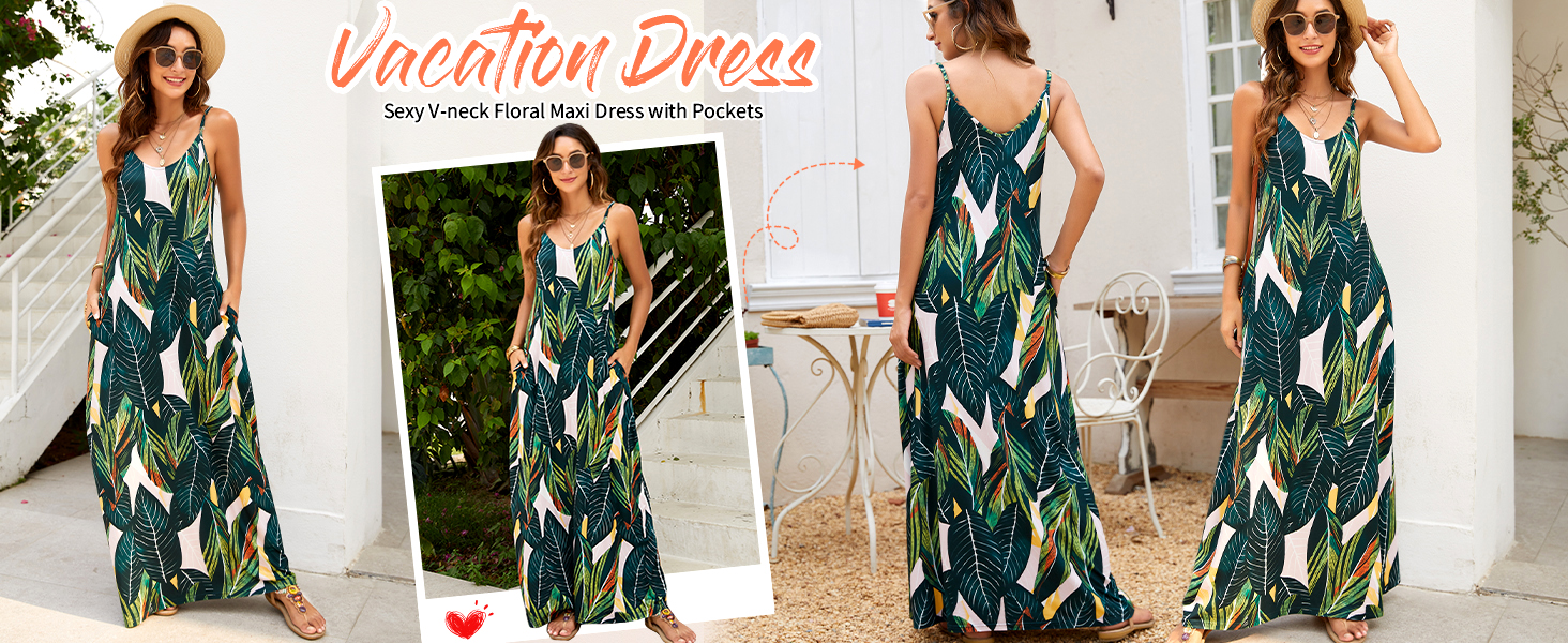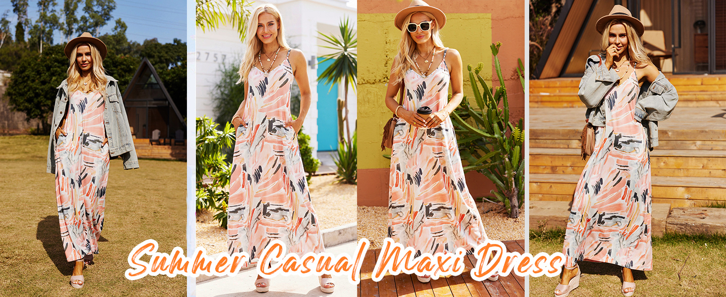 ♥ Features: floral printed,tie dye,sleeveless,pockets,adjustable spaghetti straps, v-neck,stripe,spaghetti strap,sundress,summer beach dress,bohemian long maxi dress with pockets.