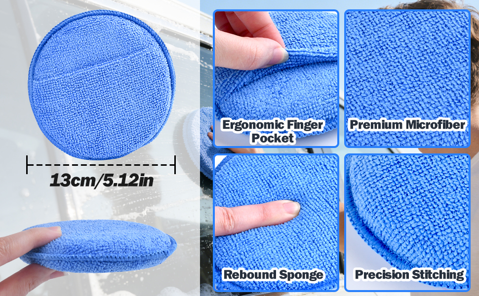 【Premium Microfiber & Built-In Sponge】These polishing pads feature a premium microfiber applicator pad surface with a soft, built-in foam core. The ultra-plush microfiber ensures even distribution of waxes and polishes while the inner sponge provides cushioning, making these applicator pads ideal for gentle, scratch-free car care.