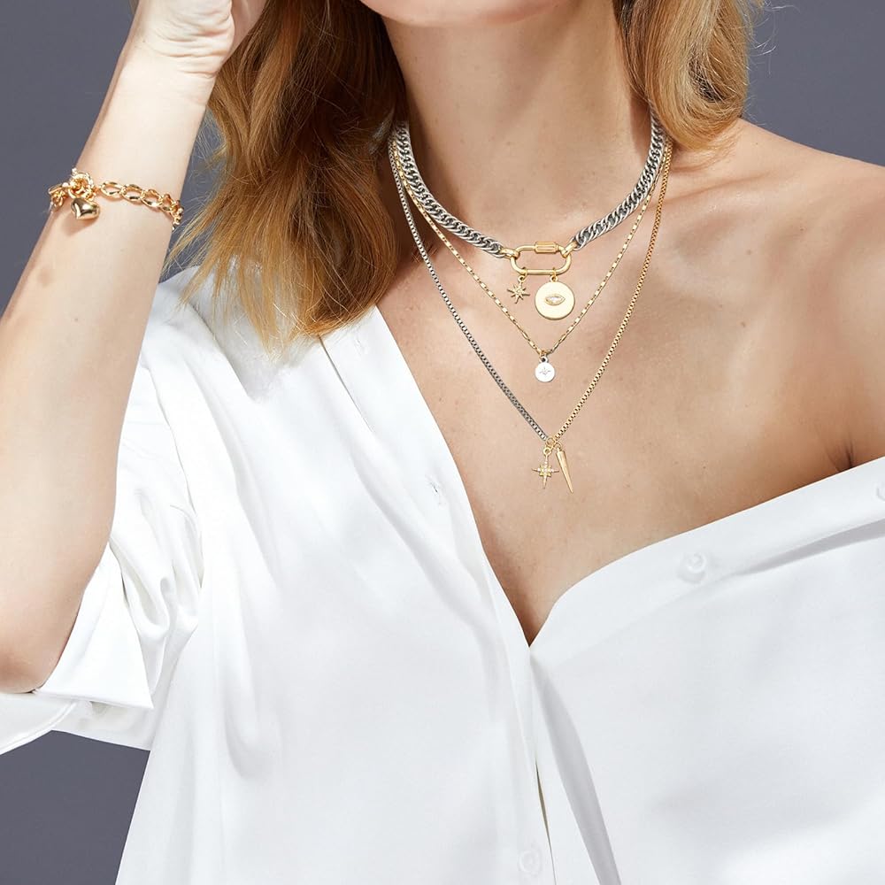 Trendy Mixed Metal Design: This Mixed Metal Layered Necklace Set includes 3 unique chains in gold, silver, and two‑tone finishes, featuring stylish pendants like evil eye, starburst, stars, and geometric spikes for a bold look. The chains can be worn together as a stacked statement or separately to suit different styles—offering versatile styling options. The metallic finish complements any makeup or outfit, effortlessly showcasing your personal charm.