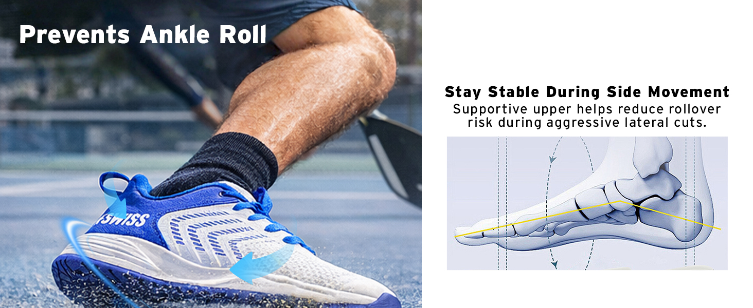 Grip & Anti-Twist Stability - Rubber outsole with lateral traction and DragGuard enhances grip. Midfoot TPU plate prevents ankle roll during sharp pickleball direction changes.
