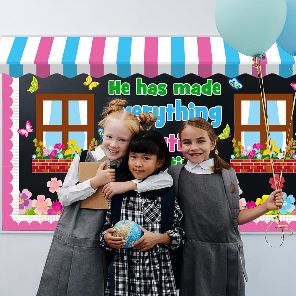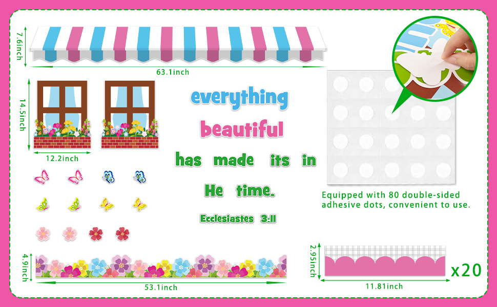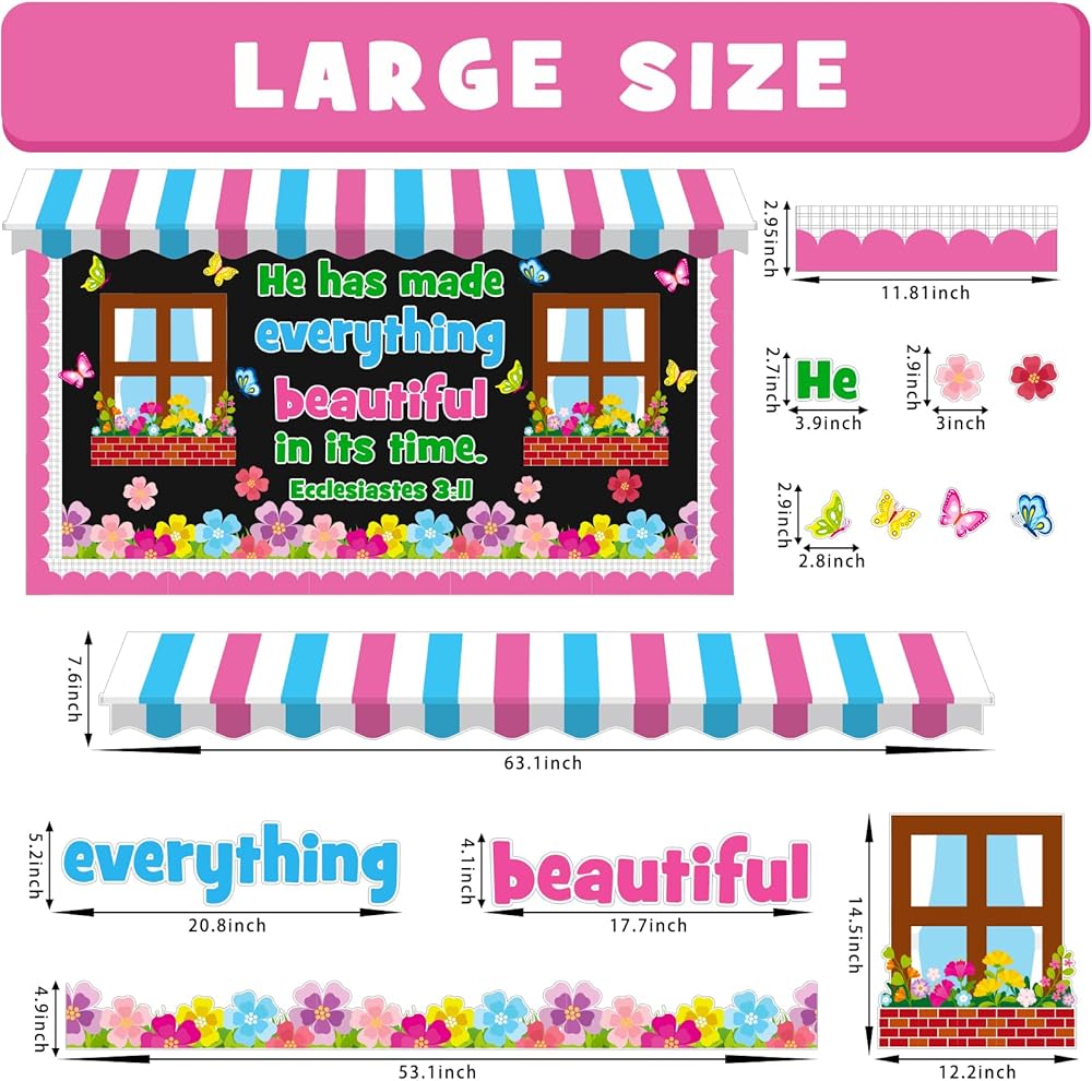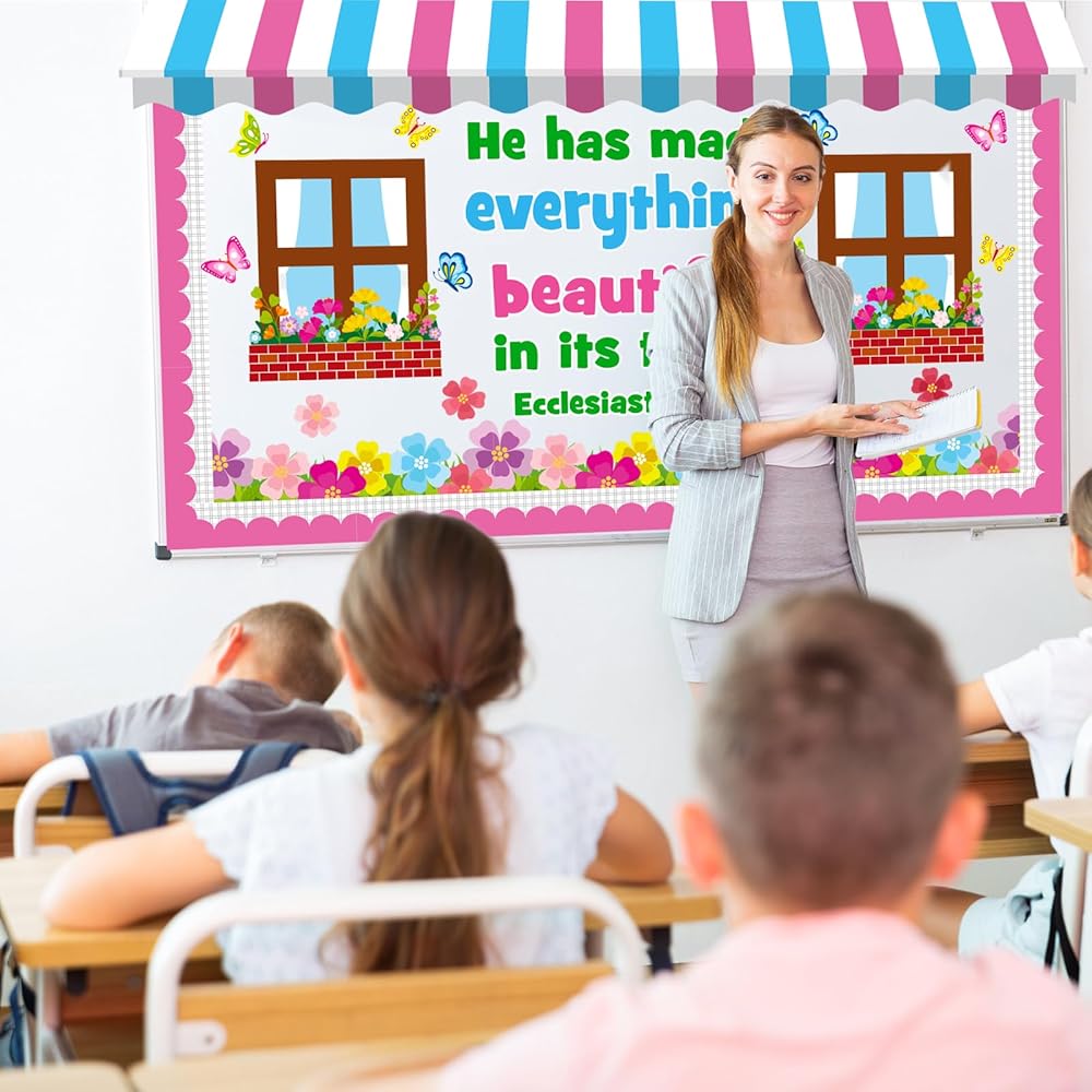 Package Includes: This spring christian bulletin board decorations includes faithful quote ‘He has made everything beautiful in its time. - Ecclesiastes 3:11' cutout, 1 lawn, 1 sunshade, 4 flowers, 8 butterflies, 2 window cutouts, 20 borders, and 80 glue points. These high-impact spring decorations create a welcoming space that celebrates each student's unique journey of blooming in faith