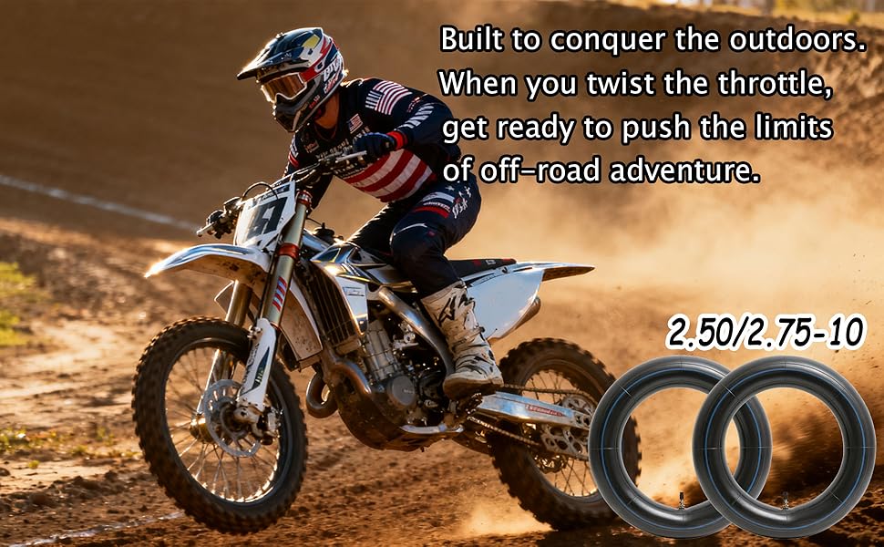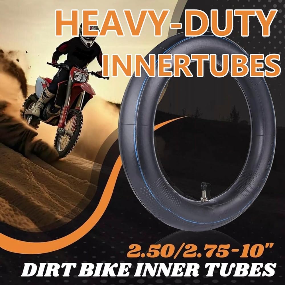 【Universal Compatible Models】:Premium 2-pack inner tubes engineered for 2.50-10, for dirt bikes with a 14-inch(OD) tires 10-inch rim and 2.5 inches to 2.75 inches tire widths. Perfectly fits Razor MX650, Razor MX500, Honda CRF50/XR50, and 49cc-70cc dirt bikes. Ideal replacement for powersports parts upgrades.