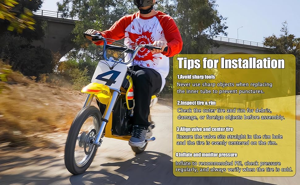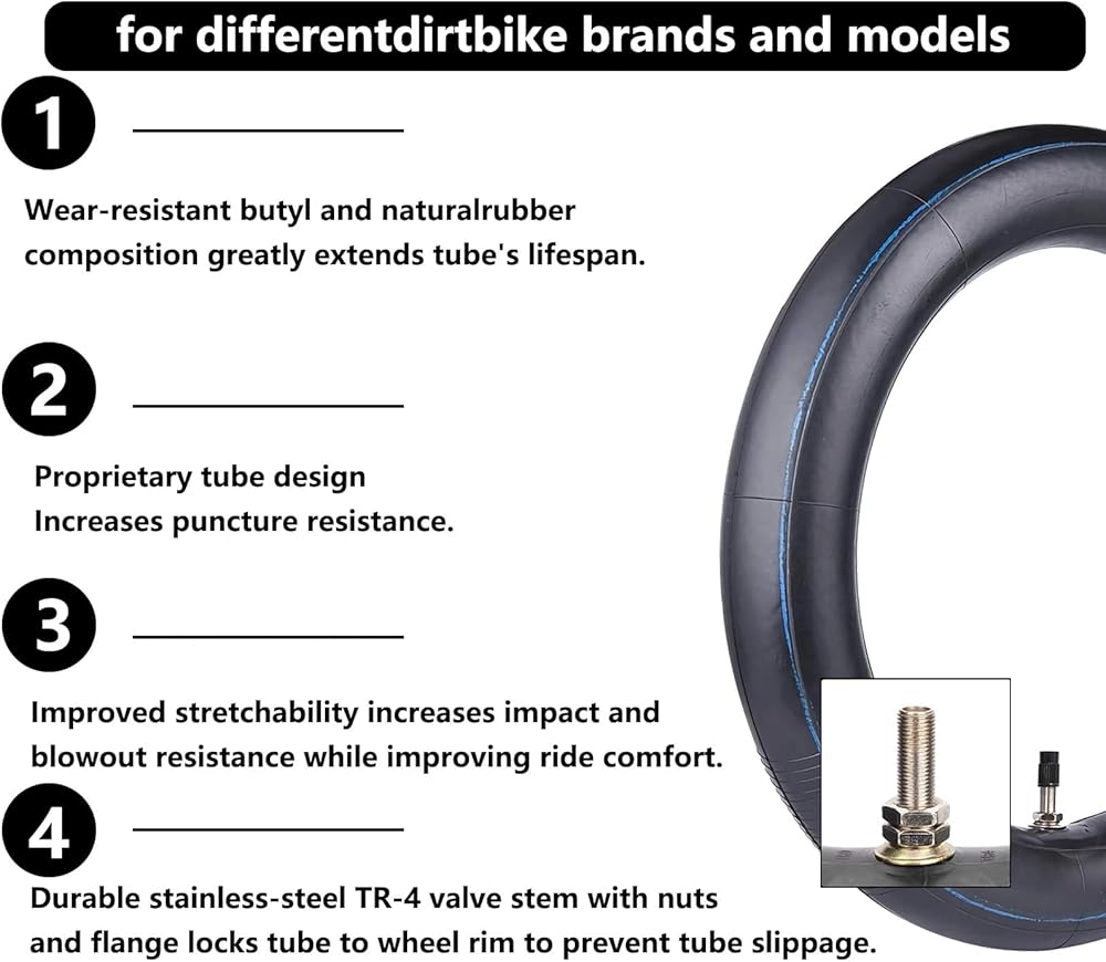 【Razor & Major Brand Compatibility】:Specifically designed for Razor dirt bike models (MX650/MX500) and popular bikes like Yamaha TTR50/PW50. Ensures seamless fit for front/rear tire tubes on dirt bike tires, minimizing installation hassles.