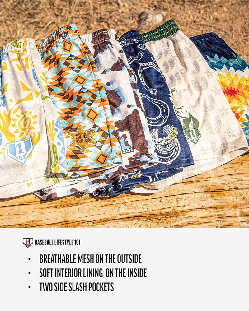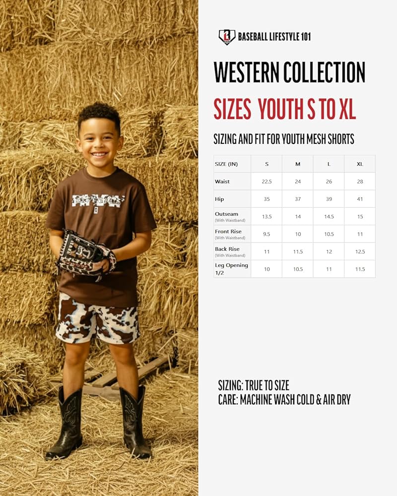 Boys mesh shorts where ranch life meets diamond life. Cowhide Curveball allover cowhide pattern brings western style to the field. Rock them offseason or in season and rep that mindset every time you step on the field.